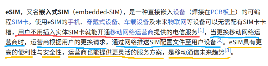 - eSIM:写死在手机主板里的电子芯片,不需要实体卡。